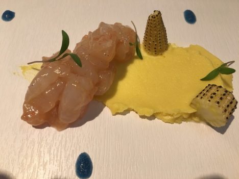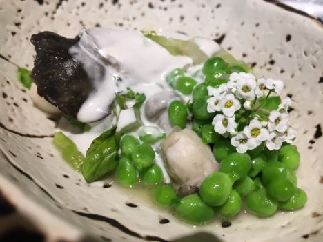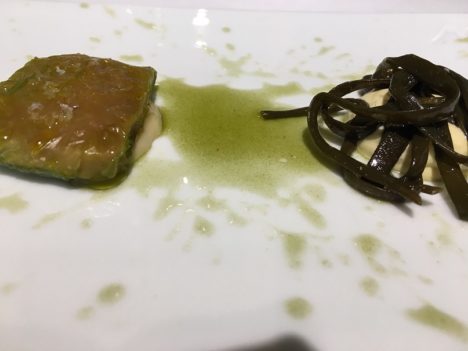 Comienzan a disiparse las dudas iniciales con un original foie gras con algas. Y desaparecen por completo con dos platos protagonizados por las verduras de temporada. Los guisantes del Maresme con cocochas de merluza y esa poco conocida seta primaveral que es la marzuelo, es una gran combinación. Como lo son los espárragos de Tudela de Duero cubiertos con una fina lámina de panceta, sobre manitas de cerdo con un ligero caldo de galeras.