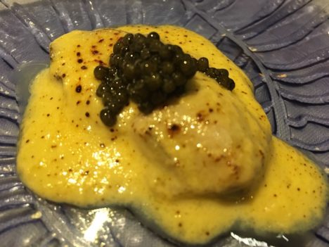 Además de la carta, ofrecen dos menús degustación. El más completo, llamado Carta Blanca, por 54 euros, 40 más si se opta por una selección de siete vinos. Empezamos un tanto dubitativos con un surtido de aperitivos irregular. Ni el cacahuete del Collaret helado, ni el mochi de naranja y jengibre, ni el cucurucho de “sang amb ceba”, ni un capuchino de alcachofa nos convencen en absoluto. Bastante planos todos. Mejor la aceituna rellena de negroni, aunque no sea un bocado demasiado original; la falsa horchata de chirivía con anguila y daditos de manzana; las croquetas del cocido, y especialmente el pepito de titaina (esa especie de pisto con atún popular en Semana Santa del valenciano barrio del Cabañal).