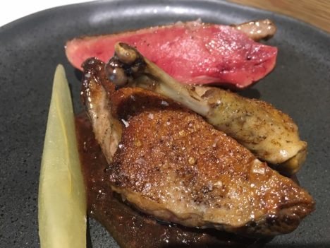 Muy bien también el lomo de salmonete de Cullera con un suquet de avellana y un changurro de sus interiores que lo potencia. Gran plato en el que se aprecia la técnica de Medina. Como se aprecia en el punto de un pichón de Lombers asado con pera. Al lado su morteruelo con un brioche. Me gusta menos este complemento, algo plano de sabor y bastante pesado. Y no me gusta nada que antes de servirlo se coloquen en la mesa unas brasas de hierbas de monte que en teoría sirven para ambientar pero que saturan el olfato.