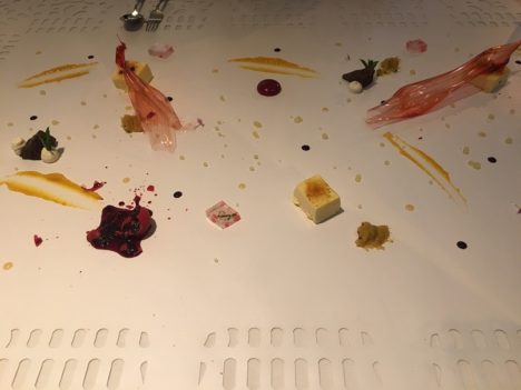 Turno para los postres. La crema de aguacate acidulado con tomillo y helado de avellanas vuelve a resultar una combinación un tanto confusa. Y como traca final, un pijama, ese postre de los 70 que combinaba flan, melocotón en almíbar nata y helado. María José lo revisa y lo presenta en la mesa sobre un hule blanco en el que a modo de lienzo va colocando muy diversos ingredientes: Flan caramelizado, mantequilla de melocotón, chutney de piña, perlas de hierbabuena, bombón líquido de cereza y cazalla, bombón de melocotón y coulis de cereza, pequeños trozos de tarta comtesa, chantillí de raifort… Un juego visual, divertido, que es fiel reflejo de la cocina de esta murciana: diversión, estética, y exuberancia de ingredientes.