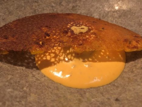 Termina la parte salada con una buena carne de rubia gallega con 45 días de maduración. Al lado, un puré de tupinambo y su corteza tostada, que aporta un toque original. Le gustan a la cocinera los tubérculos y los usa con profusión. Antes del postre disfrutamos una completa selección de quesos bien afinados: Olavidia de Jaén, Pacencia, Servilleta, Comté de 36 meses y Gamonedo del Valle.