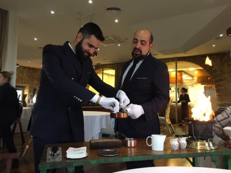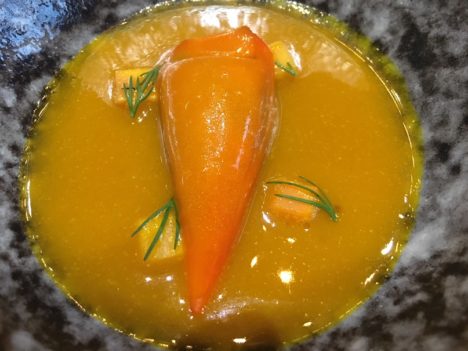 Como les decía al principio, el equipo de sala de Aponiente es ahora uno de los mejores de España. Muy pocos hay con tanta profesionalidad, tantas ganas de agradar y tanta atención a los detalles. Ángel es consciente de ello y les da mucho protagonismo. Me parece un gran acierto. Ya saben que llevo años reivindicando este apartado. Jorge Ponce, el maitre, y Francisco Fuentes, “host manager”, llegan a la mesa con un carrito para preparar el siguiente plato. Hacen una americana de coñeta y preparan un langostino de Sanlúcar con manzanilla. Langostino que luego se presenta en un babá sobre la salsa muy rico.