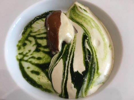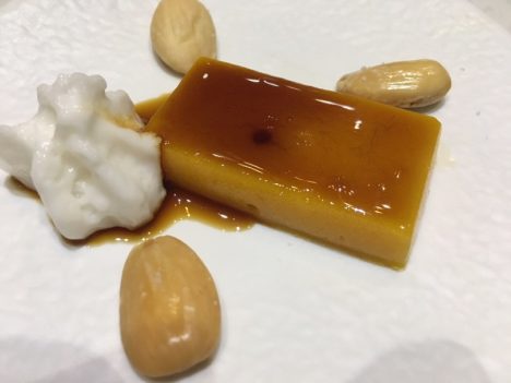 Como prepostre, un tocinillo de cielo. De nuevo un trampantojo. Tiene todo el aspecto del tradicional dulce, pero es salado. En realidad son huevas de albur con yema de huevo y una capa de pescado seco por encima. La sorpresa al tomar el primer bocado es enorme. Y el sabor a huevas en salazón intenso. Divertido y logrado. Tampoco los quesos son quesos. Diversas cremas de frutos secos, fermentados y similares. Me parecen, con diferencia, la parte más floja del menú.
