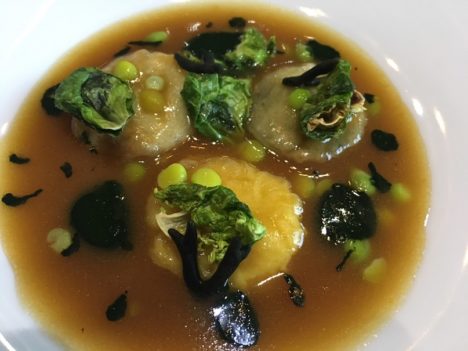 A Ángel León le gusta recuperar platos tradicionales y llevarlos al mar. Este año, una versión marina de las patatas a la importancia. Lógicamente, para valorar este plato hay que saber lo que es este guiso, y haberlo probado. En lugar de patata son las vieiras las que se rebozan y fríen antes de guisarlas en un caldo con guisantes y placton. Por encima unas algas. Está bueno el guiso, divertido el guiño, aunque no es lo mejor del menú.