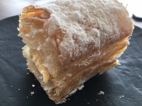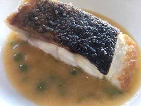 Terminamos la parte salada con dos platos francamente buenos. Una gran lubina a la brasa con pilpil de guisantes a la gallega, y una oreja glaseada con crema de ajos y almejas. Si prescindiera de estas últimas tampoco se perdería nada. La oreja, estupenda. Hay un pequeño carro de quesos que se presenta antes de los postres y en el que se echa en falta mayor presencia de gallegos. Muy buenos postres. Agradable y fresco el de vainilla, limón y cardamomo, y espléndido hojaldre en un milhojas de crema de vainilla de Tahití y chocolate blanco. Para beber, atractiva bodega con precios contenidos. Me limité a un Adega do Moucho, un blanco que cada vez me gusta más.