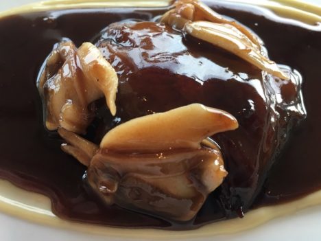Como digo, la cocina de Veira, bien respaldado por Iria Espinosa, su jefa de cocina desde hace muchos años, es sólida, algo barroca en ocasiones (hay veces en que con un ingrediente menos el plato quedaría más redondo), pero combinando siempre con originalidad los productos del mar y de la tierra gallegos, bien unidos por fondos sabrosos. Todo reflejado en una carta y en dos menús degustación. El más largo de los dos (75 euros), incluye aperitivos, doce platos, tres postres y petit fours. Un menú a la gallega. Mesa sin mantel (¡ay!) pero sin embargo servilletas de calidad que se cambian cuando es necesario. Cuanto menos, contradictorio.