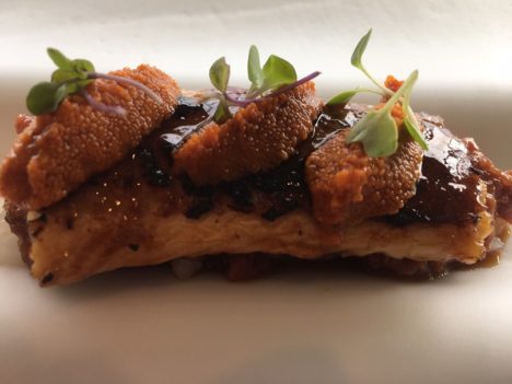 Muy ricos los mejillones en caldo de pimentón y yuzu, mientras que el cordero con cigala, percebes y trufa, un mar y montaña interesante, queda desequilibrado por la potencia de la carne del cordero. También es un mar y montaña el que para mí fue el mejor plato del menú: un peculiar niguiri con base de arroz de sushi, tartar de vaca gallega, erizo fresco y anguila. Una elaboración arriesgada pero que da un excelente resultado.