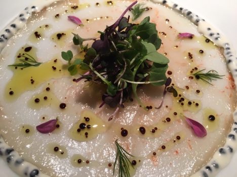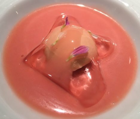 Del segundo menú, el de Mar y Campo, fresca apertura con el ravioli de zanahoria con ortiguilla e hinojo y con las gambas marinadas (en carpaccio) con crema agria. Dan paso a uno de los mejores platos de esta secuencia, el bloody mary de remolacha con berberechos, granizado de tomate y helado de cebolleta. Me consta que hay gente a la que no le ha gustado. Tal vez por la presencia de la remolacha. A mí me encanta. Cuestión de gustos. Pero me pareció una extraordinaria combinación, muy veraniega. Como fresca es la versión del ceviche de corvina, elegante e intenso, que acompaña con una esfera de maracuyá y leche de tigre.