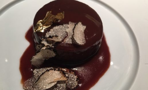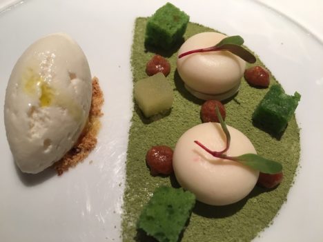 Dos versiones de las ostras. Una a la parrilla con crema de vermut blanco y polvo de aove. Otra frita, envuelta en un papel de frutos rojos y kimchi. Muy ricas ambas. Bien la merluza con almendras tiernas, coliflor y una emulsión de ajoblanco y nabo que la arropaba. Y sobresaliente el carabinero, en tres partes: una royal con cerdo ibérico, el cuerpo rodeado de una tierra de maíz y chipotle y la cabeza para chupar. A continuación el único pase sin presencia marina. Toño ha recuperado otro clásico de su cocina, la perdiz al modo de Alcántara, que ahora presenta como una royal con chocolate y oporto (foto que encabeza el post). Excelente. Al lado una copa con el consomé de la perdiz. Un plato para repetir y repetir. Me suscitó algunas dudas el prepostre: torta del Casar (un icono en la cocina de Atrio) con membrillo sobre un bizcocho de té matcha y aceite de oliva. No acabo de entender la combinación torta-té, dos sabores potentes que no se integran. Eso sí, el tocinillo con helado de yogur que llegó a continuación nos devolvió a los mejores sabores de esta cocina.