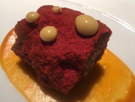 En el menú Cochino, que fue el de nuestra primera noche, muchos platos brillantes. El de jamón, mayonesa y tomate; la empanadilla de taro rellena de la popular sopa de tomate extremeña con manteca y comino; o el bocadillo de calamar, un bollo de tinta con calamar y guiso de oreja. El mejor de la noche, el milhojas de vieiras y manitas con caviar en un potente y magnífico caldo de cocido con hierbabuena al estilo del puchero andaluz. Pero no le anduvieron a la zaga las esferas de lagarto ibérico con callos de bacalao y un toque de garam masala; la careta de cerdo con cigala y jugo cremoso de ave (un plato que creó Toño hace ya 27 años y por el que no pasa el tiempo); o la pluma crujiente en tempura de mostaza y recubierta de un falso pimentón hecho con tomate.