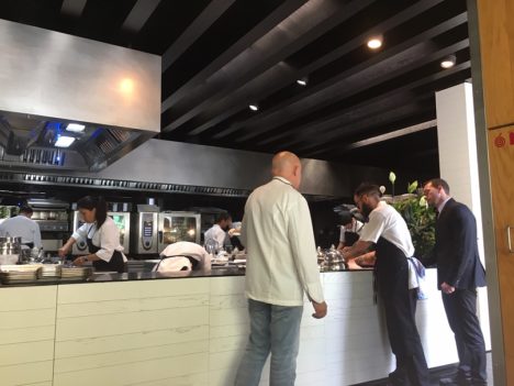 Así que mientras contemplamos de una de las cocinas mejor organizadas que he visto en un restaurante, en la que todo funciona como un reloj sin dejarse impresionar por la mirada atenta de unos comensales “inoportunos”, van pasando por nuestra mesa algunos clásicos de la casa. El histórico milhojas de boquerones; unas ortiguillas fritas y cubiertas de caviar; más caviar, esta vez con huevo, en un plato con el que Toño quiso rendir homenaje a Tomás Herranz y su Cenador del Prado; un arroz con setas; el cabrito asado, con una salsa reducida que debería servir de ejemplo en las escuelas de hostelería… Para terminar, una sopa de higos con vainilla, frutos rojos y helados de nata. La hace en muy pocas ocasiones, pero se la había pedido el cómico Florentino Fernández, que está comiendo en el comedor con Santiago Segura y José Mota, así que también nos la da a probar a nosotros.