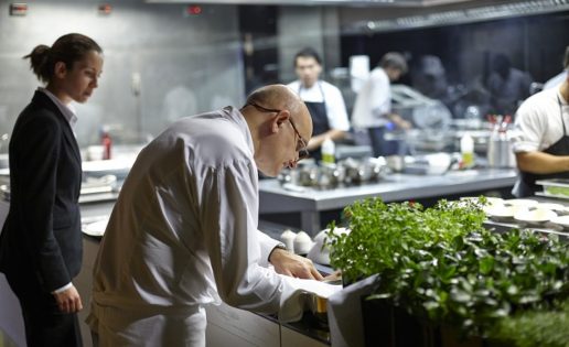 Más mar. La cigala verde, otra atrevida combinación en la que el crustáceo va con una crema de kiwi y mostaza, pak choi y algas crujientes. Y de nuevo funciona. Luego una lubina en su punto exacto de cocción, acompañada de puré de coliflor, brócoli y habitas. Y un gran clásico que nunca decepciona: la panceta ibérica con puré de apionabo y caviar beluga. Cerramos con el venado “negro torrefacto”, dos trozos aparentemente carbonizados, bien jugosos por dentro, con cebolla, pera y mostaza. El tratamiento de la caza define a los grandes cocineros.