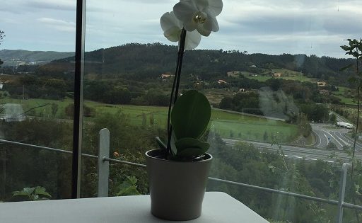 Finalmente pasamos al comedor, tan espacioso como el resto de zonas. Unas trece mesas, con gran distancia entre ellas. Confortable y acogedor. Toda la pared es de cristal. De un lado, la cocina, del otro el valle que rodea Larrabetzu. Abajo puede verse también el primitivo edificio de Azurmendi, convertido ahora en zona para eventos donde hay un restaurante informal, “Pret a Porter”. Y rodeando todo los viñedos de los que sale ese chacolí Gorka Izagirre.