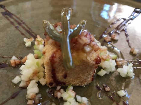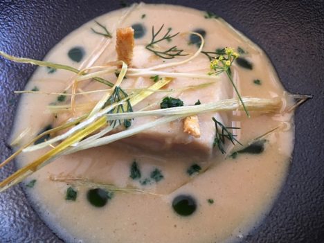 Habíamos empezado con un aperitivo con un cremoso de cerveza con almendras (plano de sabor), un bombón de pericana (simplemente correcto), y una original croqueta de ropa vieja trabajada en frío y sin gluten (lo mejor de los tres). Bien el buñuelo de cerveza negra con brandada, con alioli de azafrán, y el salmorejo hecho con pan tostado y un toque de sandía. Encima, tomate seco con curry rojo y albahaca.
