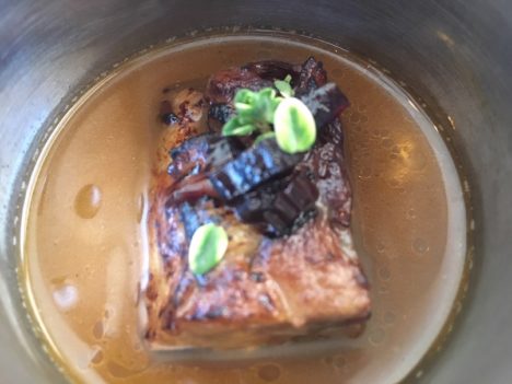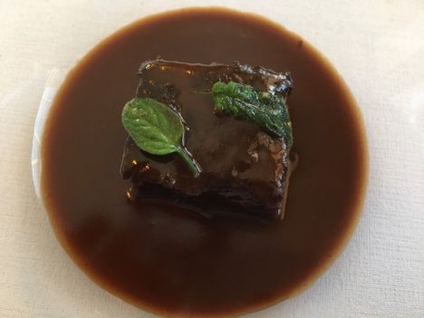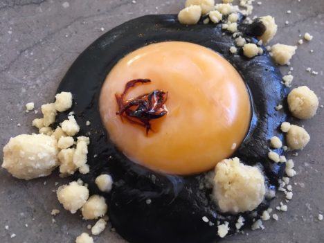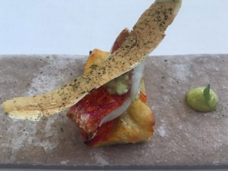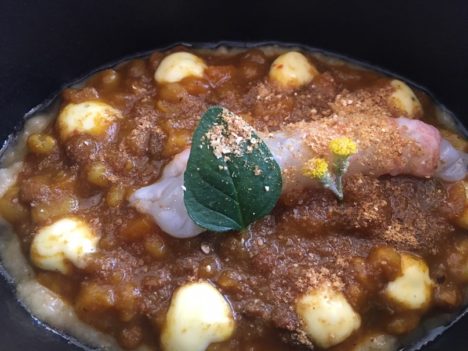 Y más recetario tradicional con el bollitori, un guiso de bacalao, que en este caso se presenta en forma de mayonesa para acompañar a un cuajo de erizo de mar, como un pastel, que lleva encima una quisquilla alicantina, huevas de salmón, un toque de hierba luisa y sal hecha con cabezas de quisquillas. Interesante interpretación del pastel de pescado. Falla por completo a sardina con turrón y algas. El pescado sin textura y el conjunto muy plano pese a que entre los ingredientes hay chile habanero fermentado, lechuga de mar encurtida en aceitunas manzanilla y la propia sardina se trata con agua de mar. Tampoco aporta nada el turrón que sirve de base.