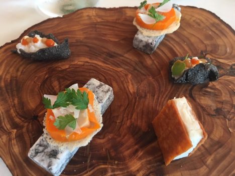 En Bardal se trabaja sin carta. Sólo dos menús, que varían en su longitud, por 85 y 95 euros. El más largo, el Gran Menú, consta de 21 pases. Se abre con una refrescante sopa de hierbas con tapioca cítrica y un poco de queso payoyo a la que siguen una serie de pequeños bocados que nos recuerdan que Benito Gómez siempre ha dominado el mundo de las tapas: bollo cremoso de brandada de anguila ahumada; arroz negro crujiente con calamar; huevo, patata y cresta de gallo… El que más me gusta es el hígado de rape en manteca colorá, un acierto. Y el que menos el corte helado de queso al romero, muy plano de sabor.
