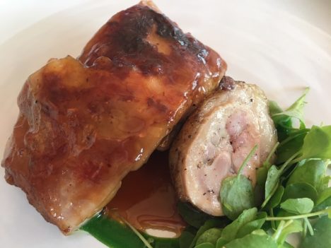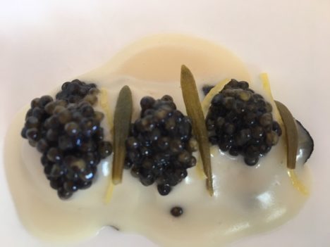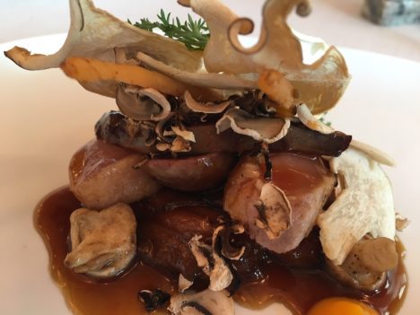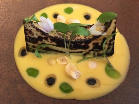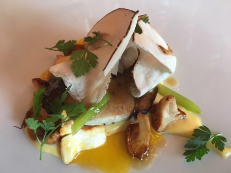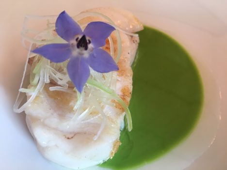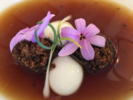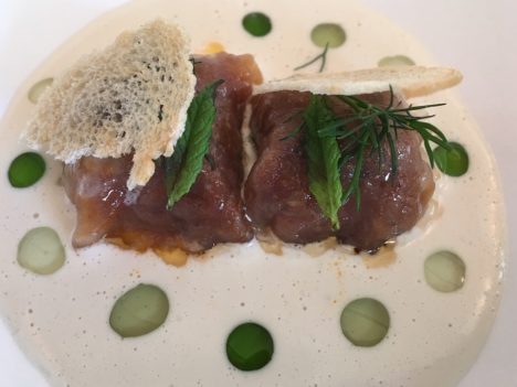 Y en tercer lugar la sopa de caracol. El cocinero funde aquí sus orígenes catalanes con su Andalucía de adopción. Y aprovecha que estamos en plena temporada del caracol para lograr otro plato de enorme brillantez. Unos raviolis de tocino rellenos de caracoles grandes, a la catalana, en un caldo de caracolillos a la andaluza que refuerza con chile chipotle (para mucha gente puede resultar picante en exceso, a mí me encanta). Refresca todo con una ensalada de hierbas silvestres. Enorme plato.