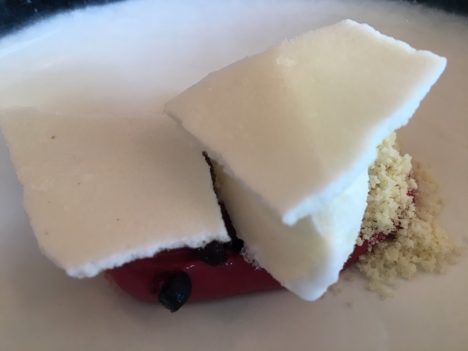 Entre sopa y sopa van pasando otros. La concha fina en un jugo de su agua con alga codium y acedera marina. Uno de los platos que bajan el gran nivel medio, muy plano, con el molusco desaparecido. El agradable revuelto de setas de primavera. El conejo a la cazadora, que es otra de las pocas decepciones del menú. Lomos, riñones e hígado con setas en un conjunto confuso a la hora de comerlo. Se sale de la línea de presentaciones aparentemente sencillas. O la paletilla asada de chivo con berros que cierra la parte salada, presentada con uno de sus riñones, y el contrapunto de esos berros de los que antes les hablaba. Le precede un panecillo hecho con la grasa del chivo y relleno de sus menudillos. Delicado, pero aquí curiosamente falta potencia.