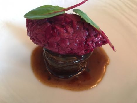 Hay otros tres platos que merecen mención aparte. La ostra al vapor con crema de tuétano, caviar e hinojo marino es un acierto. Da gran resultado la incorporación de la ostra a un clásico como la mezcla de tuétano y caviar. Lograda combinación de texturas y profundidad de sabor. Especialmente interesante resulta la royal y tartar de pato. Un inteligente juego que mezcla un mismo producto guisado y en crudo. Dos texturas, dos sabores. La royal, impecable, demuestra la sólida formación del cocinero. Y encima, el tartar, que incorpora remolacha para darle más color. Destacado también el resultado que obtiene con el rape en salmuera. Unos minutos cubierto de sal, y otros en salmuera, antes de confitarlo confieren al pescado una textura y un punto magníficos. No falta, claro, un jugo. En este caso con la cabeza del rape y, de nuevo hierbas. Para mi gusto sobra la excesiva cantidad de apio.