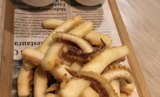 Del Cos al vecino EL MACHI. Me dejó impresionado allí el expositor de pescados, donde, entre otras joyas marinas, se mostraba un espectacular rape de 13 kilos. Impresionante. En la barra, de nuevo unas rabas, correctas sin más. Y también anchoas, que volvían a ser de Codesa. Además, una tapita de bígaros (o caracolillos, como se conocen en Santander). Estos bichitos eran bien habituales en las barras del Cantábrico, pero poco a poco van desapareciendo. La tentadora oferta de pescados invitaba a quedarse allí a comer, pero lo dejamos para otra ocasión porque aún quedaba ruta.