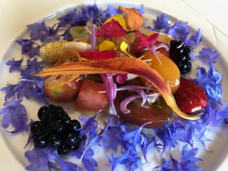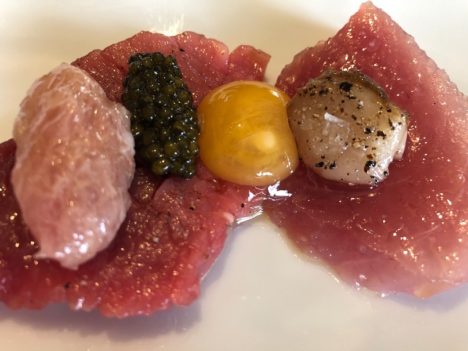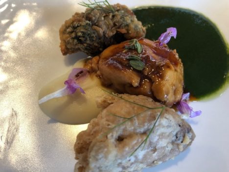 Dos entradas muy veraniegas, excelentes ambas. La que llama “verano crujiente” es una combinación muy visual (y con mucho sabor) de frutos y hierbas silvestres del entorno. La otra una refrescante cuajada de apio con licuado de pepino yodado. Sigue el plato más decepcionante de la comida: una combinación de ternera asturiana y bonito del norte. Un trozo de cada uno sobre el que coloca sus grasas, pero al revés. Sobre la ternera, grasa del bonito. Sobre el bonito, tuétano de la ternera. En medio, una yema de huevo y algo de caviar (innecesario). No funciona la combinación, demasiado pesada y demasiado confusa. Tal vez el bonito solo con el tuétano tendría más sentido.