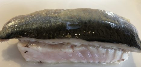 Comenzamos sentados en la terraza con una copa de sidra brut de Valle Ballina acompañada de una tacita de caldo y un crujiente de bacalao bastante mejorable. Ya en el comedor de la planta superior la cosa se endereza. Las fabas fritas, las lapas a la sidra y el bocado de pececito de roca son aperitivos de mucho nivel, especialmente esas fabas que son para comerse una bolsa entera.