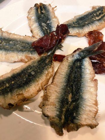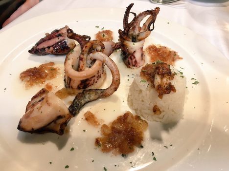 Antes, como entradas, habíamos tomado unos bocartes estupendos, sugerencia del día, abiertos y fritos. Y un paté de oricios que no pasó de correcto. En la mesa, uno de mis acompañantes optó por otra de las recomendaciones del día, unos chipirones “afogaos” (salteados con cebolla), acompañados de arroz blanco. Otro bocado de lujo.