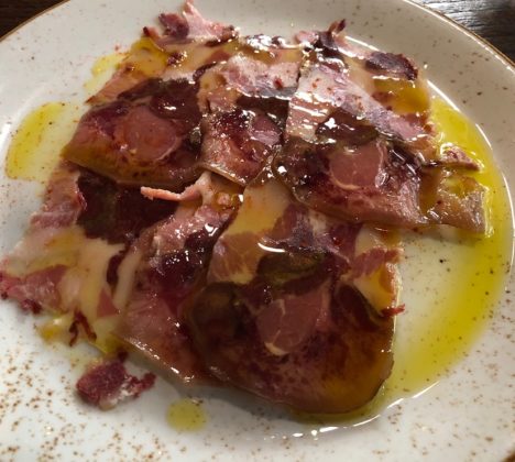 De los platos que probamos en La Faragulla (nombre que reciben en Galicia las migas de pan que quedan sobre la mesa) me quedo especialmente con la cachucha y lacón prensados al modo antiguo, regados con aceite de arbequina gallego. Gran plato. Notables también las truchas envueltas en panceta y presentadas sobre un pan de maíz con mayonesa de pimientos de Padrón.