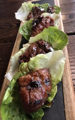 Me gustaron mucho también las mollejas de ternera a la brasa, glaseadas con chimichurri, que sirve sobre hojas de lechuga al estilo oriental para comer con la mano. Muy sabrosas. Y la cabezada de porco celta de producción ecológica, hecha también a la brasa y glaseada. Fusión con oriente en el chili buey de mar. Pasado igualmente por las brasas, y presentado en su caparazón, desmigado, al modo de un changurro pero con leche de coco. No está mal, aunque se echa en falta más alegría con el picante.