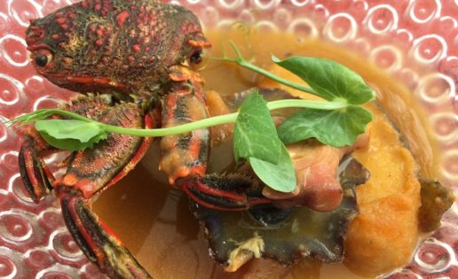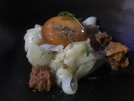 Notables entre los aperitivos las lapas en vinagre y las huevas de bacalao en salazón. Muy interesante el jamón de atún fresco casero con sorbete de tomate. Y excepcional la crema de gamba roja, uno de los tres platos del menú que nos preparó Peñate. Los otros dos, los tagliatelle de calamar con “marbonara” de erizo (creo que la palabra marbonara es de Andrea Tumbarello para definir una carbonara marina), que combinan textura y sabor, y el cherne en papillote de lechuga de mar. Este último plato se prepara en la mesa, sacando el pescado, impecable de punto, de su envoltura de algas. Se acompaña con una salsa verde de cilantro. Tres platos que justifican, por sí solos, la visita.
