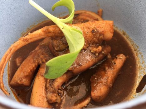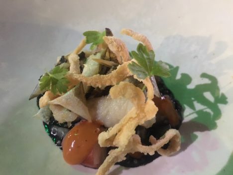 LAS ROCAS. En Costa Adeje, pertenece al hotel Jardín Tropical aunque está situado fuera de su recinto, en el paseo marítimo, sobre el mar. Sin duda la mejor experiencia de las cuatro vividas estos días. Me ha gustado mucho la oferta, exclusivamente marina, de Jorge Peñate. Producto de calidad,técnica y elegancia a partes iguales, combinadas con un exquisito tratamiento del punto de los pescados. Fondos potentes y el recetario tradicional canario como base. Elabora su propia sal y ahora trabaja en busca de buenos salazones y ahumados. Peñate, aventajado discípulo de Braulio Simancas, uno de los pioneros en la recuperación de la cocina popular isleña, ganó el campeonato de cocineros de Canarias en 2014 siendo yo presidente del jurado. Me lo recordó durante la cena, agradecido porque entonces le dije que tenía mucho recorrido por delante. Y así ha sido.