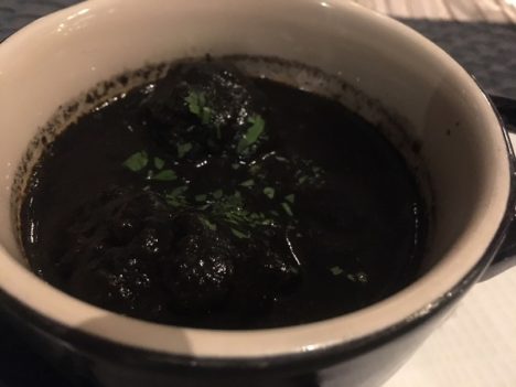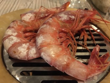 De este primer bloque se salvan una muy lograda sopa negra de chocos y picada de avellanas, sabrosa, y un más que correcto adobo, bien frito. Lo mejor en cualquier caso llega en la parte final, con unas soberbias gambas rojas de Málaga y una excepcional urta a la parrilla. No me gusta que las gambas se presenten en pequeños recipientes con brasas, con el peligro de que se pasen de punto si el comensal se despista.