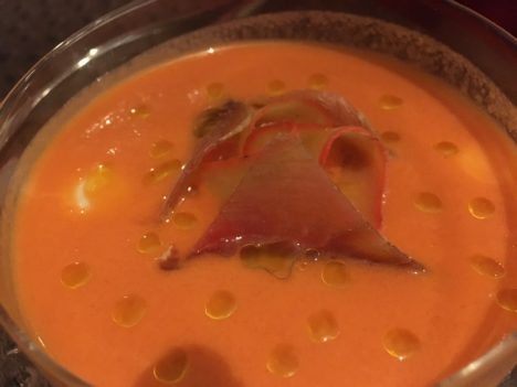 Repasemos los platos que probamos. Muy bueno el hÃgado de rape acompañado con miga de pimentón que llega como aperitivo. Y bastante flojos, marcados por los sabores planos, los ya citados salpicón de langostinos (con los crustáceos, además, pasados de cocción) y tomate de Conil con mejillones, lo mismo que una ensaladilla rusa muy insulsa, a la que salva en parte la utilización de ese excelente salmón que ahúman en la localidad canaria de Uga. Suma y sigue: el salmorejo con mojama es más bien un gazpacho y además está mal ligado, como si hubiera sido hecho horas antes y no se le hubiera dado un repaso antes de servirlo