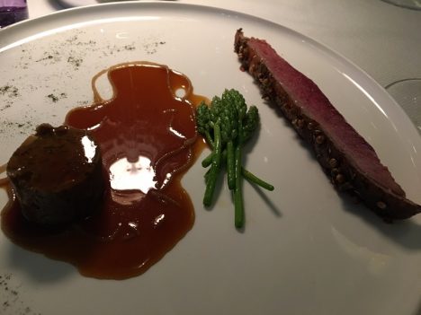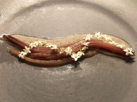 Otro plato de la noche, que desgraciadamente ya no podrán probar hasta el año que viene, fueron los genuinos guisantes lágrima con verdolaga, trozos de anguila y un yogur de foie gras. Magnífica combinación. A gran nivel también la anchoa en salazón, cortada de una manera peculiar, en tiras, que le da una textura muy diferente. Va con una ligera mousse de trufa y flor de sal. Y para cerrar un póquer de ases, otro plato para el recuerdo, el pato con el que concluye la parte salada del menú. Una pechuga de pato que se madura entera durante catorce días en un curry de ajo negro, cilantro y pimienta. Se sirve un trozo cortado, y al lado una royal clásica hecha con sus muslos y trigo verde cocido. Jugosa, intensa, un acierto.