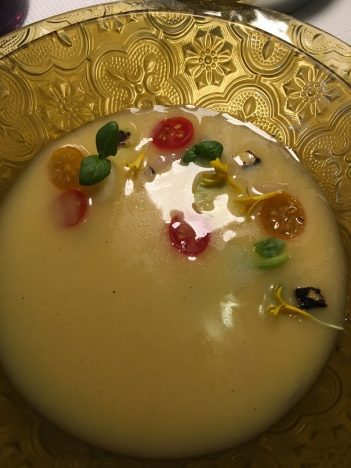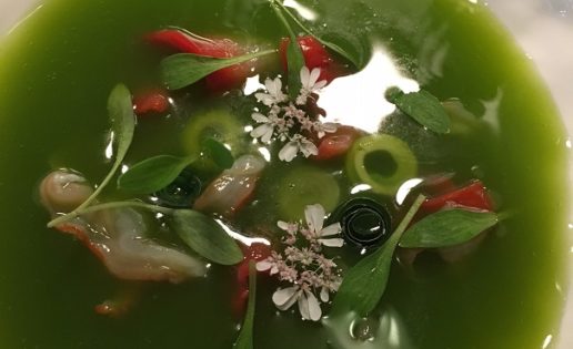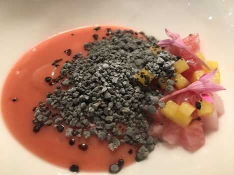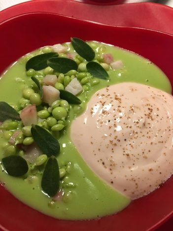 De todo lo que pasó por nuestra mesa me quedo especialmente con los tres gazpachos que sirve consecutivamente y que nos devuelven al gran especialista en sopas frías, a aquel que ya nos maravillaba en el Tragabuches de Ronda al que peregrinábamos todos los veranos. Son tres gazpachos muy diferentes pero excelentes los tres. Curiosamente servidos de más a menos en lo que a intensidad se refiere. Primero uno verde (foto que encabeza el post), a partir de un jugo de ceviche con agua de tomate que se sirve sobre conchas finas. Lleva pepino, manzana y cilantro. Muy potente, con un razonable punto de picante, es una explosión de sabor. El enlace entre Andalucía y Perú. El segundo es un gazpacho amarillo, a base de tomates y pimientos de este color y al que se añade aguacate y bolos malagueños. Menos intenso, con un toque más graso, pero igual de sabroso y refrescante. Cierra el trío un gazpacho rojo, de melocotón con atún y sémola de aceitunas negras. Más suave, con un ligero dulzor, contrasta con los dos anteriores.