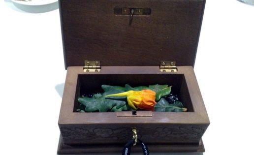 Llega entonces el momento de pasar por la cocina. La mesa de pase sube automáticamente para quedar con la altura de una barra. Allí hay unos cofres que se abren con la llave que teníamos desde el principio. Dentro una flor capuchina rellena de tartar de gamba. Y nos sirven también una pequeña porción de chateaubriand de cangrejo, muy agradable.