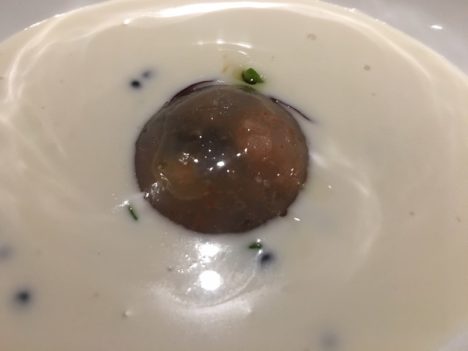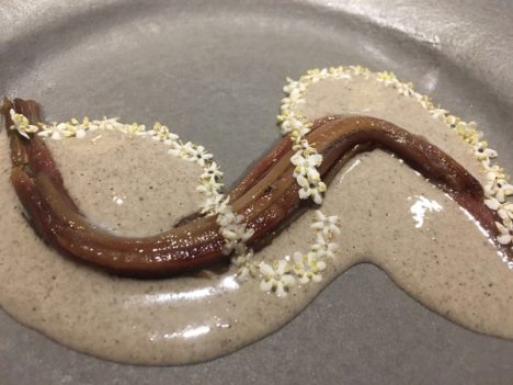 Un paso por la cocina, al que se invita a todos los clientes a lo largo de la noche, para probar una anguila a la brasa, hecha al momento en una pequeña parrilla japonesa. Excelente esta anguila que ellos mismos matan y preparan. Y también en la cocina el momento hamburguesa. Dani considera que aquella hamburguesa que hizo para McDonalds en 2015 (y que tanto criticamos algunos) le aportó una gran experiencia en muchos terrenos y por eso ha querido incluirla en este menú de despedida que repasa sus principales hitos. El pan se lo sigue enviando la multinacional americana. No se asusten, es sólo un pequeño trozo.