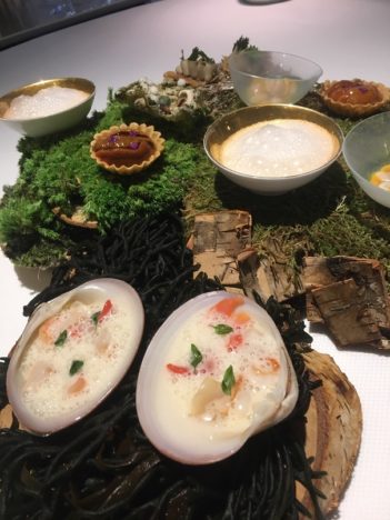 En el menú Madre aparece cada plato con el año de su creación. Varios se han actualizado, pero no pierden su esencia. Es el último menú, pero hay algunas cosas que cambiarán de aquí a octubre por adaptarse al producto de temporada. Empieza con tres aperitivos que tienen ya más de diez años: los encurtidos nitro, el huevo sin huevo y la palomita nitro de aove. Y sigue con un gran homenaje a Andalucía, a su costa y al interior, que se llama Flora y Fauna. Una bandeja en la que se presentan conchas finas con jamón, berberechos en ceviche de perejil, tartaletas de erizo, un crujiente de fondo marino con camarones y otros productos del mar, una crema de queso y un paté de perdiz.