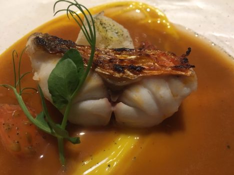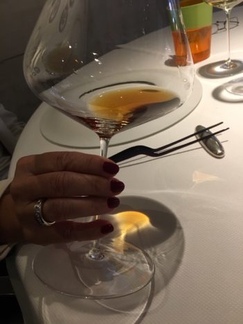 En el gazpachuelo de cigalas, otro histórico (de 2008), una novedad. En realidad una prueba que está haciendo y que quiere que conozca. En lugar de las cigalas frescas habituales me coloca una que ha tenido tres días madurando en una cámara sin nada de agua. Muy interesante la textura que logra. Todavía es un experimento, pero pronto podrá probarse en Lobito de Mar. Turno después para el plato más reciente del menú, una elaboración de este mismo año: angulas con guiso (amarillo) de anguila y palo cortado. ¿Por qué se retira Dani si sigue siendo capaz de crear cosas como esta?