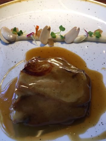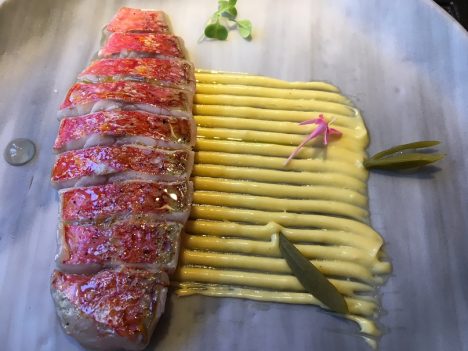 El primer plato de pescado es otro de los grandes aciertos del menú. Un lomo de salmonete, impecable por punto y textura. Al lado, una bearnesa que hacen con hinojo marino, lo que le da un toque muy especial. MagnÃficas ambas cosas por separado y magnÃfico el conjunto. Fuera de menú me incluyen un intenso guiso de callos de bacalao con garbanzos, espárragos verdes y jamón. Para repetir. Y un nuevo pescado, el san pedro con jamón, tomate y miga de pan. Otra vez impecable de punto la pieza, que gana mucho con ese acompañamiento.