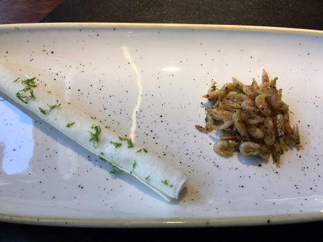 Comenzamos el menú con dos aperitivos. Un panecillo de polvilho de mandioca relleno de raifort y lima, recuerdo de su paso por Brasil, y unos camarones al ajillo. Interesante este segundo, aunque muy incómodo de comer. Camarones salteados con ajo y limón que hay que coger con la mano. Antes, una toallita impregnada en limón para frotarse la mano. El camarero dice que es para dar un toque a los camarones. Lo cierto es que apenas se aprecia, y que resulta complicado coger los camarones, pequeños y grasientos. No están mal, pero no compensan la incomodidad.