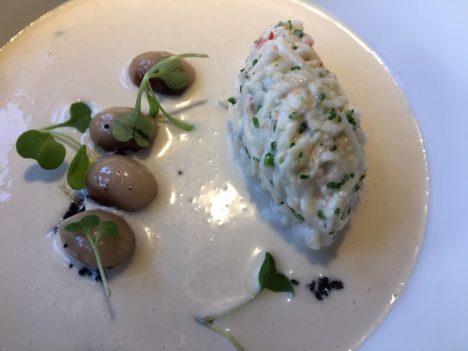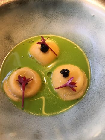 A los hermanos Torres les gustan las tabellas, un tipo de pochas frescas. En estos años las han utilizado en varios platos. Aquà elaboran una excelente crema frÃa con cangrejo real. Suave y sabrosa. De lo mejor del menú. Como dejan la jarrita en la mesa, repetimos hasta acabarla. Siguen unos ravioli de ajo negro con caldo de perejil. Falla aquà el caldo, excesivamente potente, que desequilibra el plato al anular a los ravioli, que por sà solos están muy ricos.