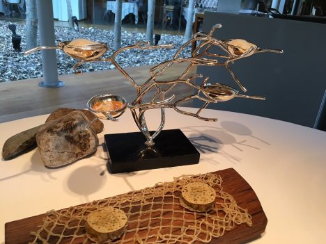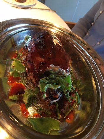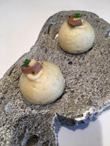 Aún un par de aperitivos más antes de pasar a la parte “seria” del menú. Otras dos delicias. Me quedo con el brioche de riñones al Jerez, un espectáculo de sabor. Podría estar comiendo y comiendo estos bollitos con todo el sabor del guiso que contienen y con la delicadeza de un brioche de masa etérea. El otro es un guiso de caracoles y cañaíllas que está bueno, pero queda un tanto eclipsado por el anterior. Joan se divierte aquí presentando el cuerpo de un caracol que tiene, a modo de concha, un riñón de conejo. Al lado, huevas de caracol.