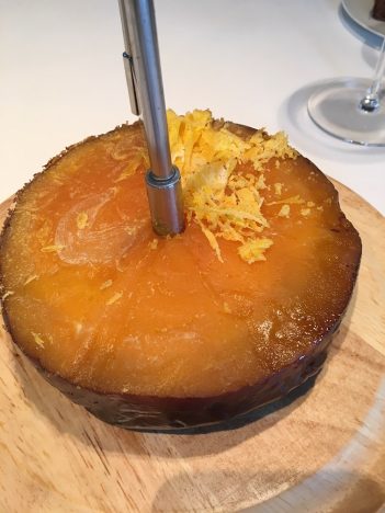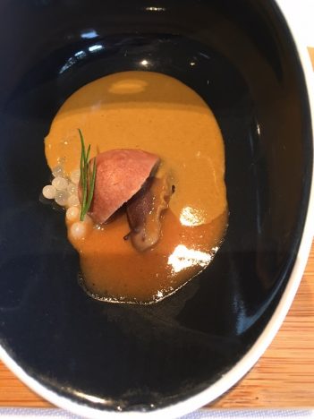 A partir de aquí el camarero ya sirve el pan, lo que hace suponer que empezamos con lo más formal del menú. Aunque podríamos repetir de nuevo todo lo anterior. No me importaría. Compleja y agradable la concha de ostra liofilizada, una combinación de tartar de ostra, melva, nuez tierna, manzana verde mayonesa de té y polvo de bergamota. Y muy interesante el concepto de la yema de huevo curada y ahumada, que se presenta como si fuera un queso Tête de Moine, y que se ralla sobre un guiso de rebozuelos, botarga, orejones y boniato. El fondo, un demi-glace de boniato.