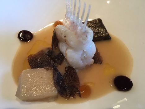 No suele faltar en el menú de Can Roca la gamba de Palamós. La de este año supera a las anteriores, con las patas crujientes, una salsa de anémonas y en el fondo del plato una velouté del jugo de su cabeza. Maravillosa. Más mar con los ravioli de piel de lenguado, uno blanco y otro negro (en función de la zona de la piel de la que proceden), rellenos de tupinambo. Otro trabajo muy interesante. Lleva también un trozo del mismo pescado presentado con sus espinas como si fuera un costillar sobre una meuniere. Y se completa con algo de trufa negra. Aquí el fondo, tan potente, está por encima del lenguado.
