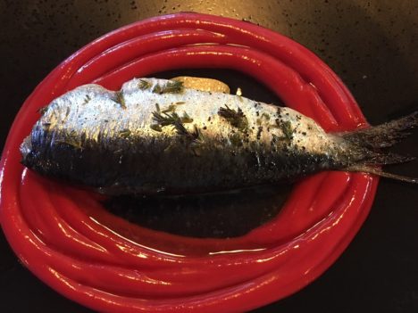 Empezamos con la sardina asada con tomillo. Una presentación muy estética ya que el pescado va rodeado de un salmorejo de remolacha, que además está bueno. Muy rica la sardina, perfecta de punto, con el aroma del tomillo arropándola. A continuación, salmón a la llama con una agradable vinagreta caliente de ajos y chiles (que podría picar un poco más sin problema). Como les decía antes, Samuel cede innecesariamente a las modas e incorpora pulpo a su menú. Ahumado al momento, llega a la mesa con esa efectista y un tanto demodé campana de humo. Me sobra este plato, aunque reconozco que la base de patata y pimentón con huevo y kimchi está muy buena.