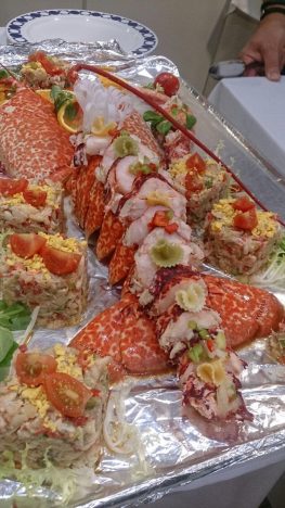 Nuestros amigos habían encargado previamente un bogavante de esos casi prehistóricos. Creo que pesaba unos tres kilos y medio. La presentación, absolutamente kitsch, como pueden ver en la imagen. Tal vez no cuadre mucho aquí aquello de la sencillez. Eso sí, nos quitaron todo el trabajo porque el bicho estaba completamente limpio. Nada de pelear con las pinzas ni con las patas. Así que en casos como este hay que dar vivas a lo kitsch. Y elogiar el trabajo de la cocina. Lo importante, en cualquier caso, es que estaba muy bueno, perfectamente cocido. Con sus tres salsas de rigor, incluida una rosa a tono con la puesta en escena.
