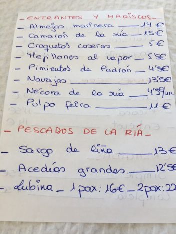 La carta es una sencilla hoja de papel, escrita a mano, que se cambia cada día en función de lo que ha llegado. Muy buena señal para empezar. En la primera cara está lo más interesante, entrantes, mariscos y pescados, la mayor parte procedentes de la misma ría de Pontevedra. En la otra cara, tres arroces y tres carnes de ternera gallega, además de dos ensaladas (en realidad, una en dos versiones: simple y completa). De los arroces presumen en su página web y por lo que vi los piden mucho los clientes, pero la verdad es que el aspecto del que tenían en la mesa de al lado no me hizo mucha gracia.