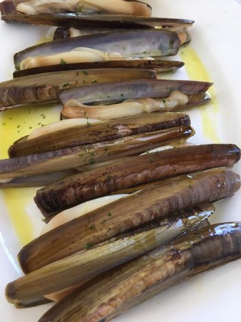 Éramos seis en la mesa y nos centramos en la primera cara de la hoja de la carta. Con mucho éxito. Los camarones de la ría (foto que encabeza el post), no muy grandes, estaban buenísimos. Ración generosa por 15 euros. También las nécoras, procedentes igualmente de la ría, de considerable tamaño y bien llenas. Pero lo mejor fueron las navajas, procedentes de las vecinas islas Cíes, de las mejores que he comido en bastante tiempo. En el lado contrario, unas croquetas caseras demasiado bastas.