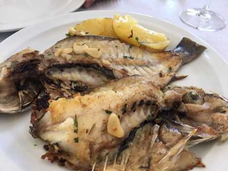De segundo, dos pescados simplemente a la plancha. Un sargo “de liña” (de anzuelo), y una lubina grande. Un poco pasado de punto el primero, pero ambos estupendos de sabor y de consistencia. Por no hablar de las patatas que los acompañaban, un lujo por sí solas.